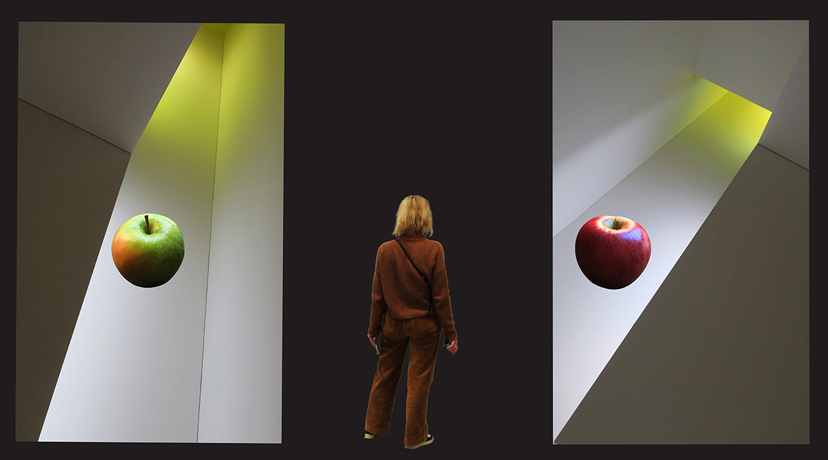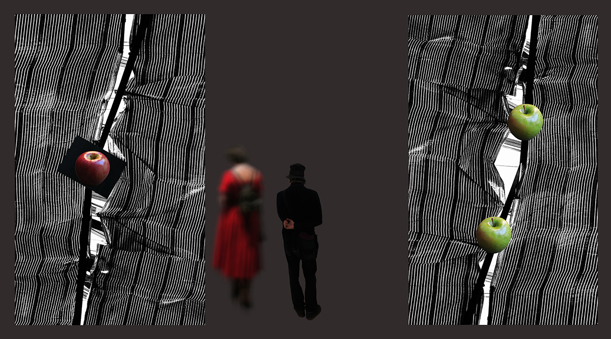 Il existe un lien peu perceptible entre la nature fluide du temps et la conception que les humains ont et ont eu du temps tout le long de leur Histoire. Le Temps Mort, est un temps figé dans le passé, il a perdu son élasticité, il stagne. Les humains qui le traversent ont perdu la capacité d’inventer ; tyrans ou sujets de la tyrannie, ils deviennent de plus en plus flous, au risque de disparaître, puisqu’ils vivent dans une impasse imposée ou celle qu’ils ont eux-mêmes choisie. Faire le choix du Temps Vivant, à l’image de la pomme rouge biblique, dans la série de photos, n’est pas une Tentation, un Interdit, mais la curiosité de savoir ou la curiosité de vivre autrement. Cet interdit supprimé, le Temps Vivant, à l’image de la pomme devenue verte ou possible, dans la série, serait la Vie même, réinventée - l’envie de créer un futur, dans un espace ouvert, qui fait de la Liberté de rêver, de créer et de construire, non pas une tentation, un interdit, mais un Droit.
